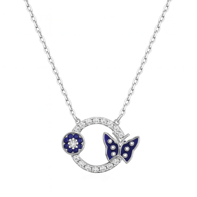 925 Sterling Silver Blue Enamel Butterfly & Floral Charm Necklace