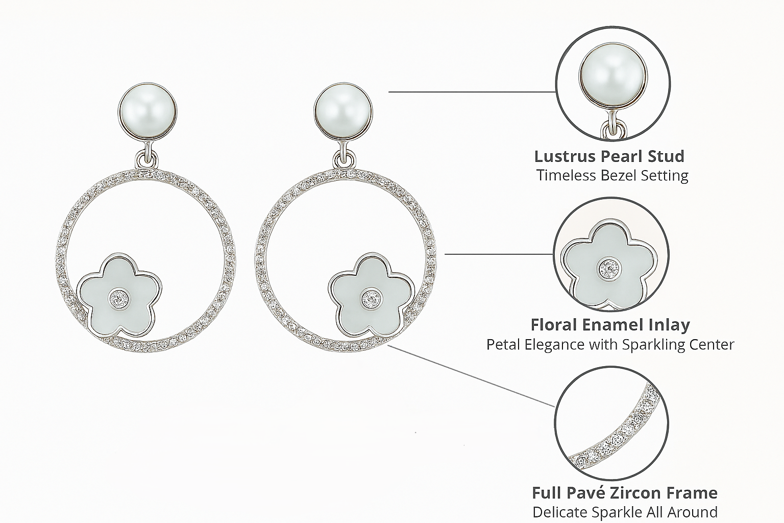 Elegant yet playful, these hoop earrings feature a luminous pearl stud top and a delicate floral charm in soft white enamel, set within a halo of sparkling CZ stones. Crafted from hallmarked 925 sterling silver, they blend minimal elegance with intricate detailing.