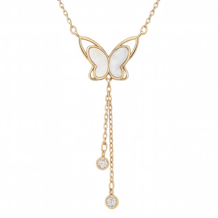 Grace your neckline with the ethereal beauty of our Mother of Pearl Butterfly Necklace in a stunning 18K gold-plated finish. The intricately crafted butterfly pendant features shimmering mother of pearl wings, symbolizing transformation and elegance. Two delicate chains with sparkling zircon drops add graceful movement and modern charm.